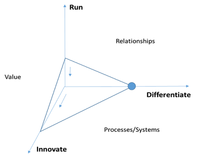 "Innovate," "Differentiate," and "Run" axes form three planes, where we can place three critical procurement deliverables – Value, Relationships, and Processes/Systems.
